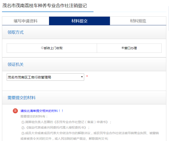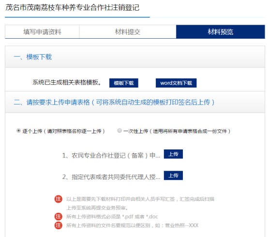 可點(diǎn)擊生成并下載PDF文件,打印后由申請人在相應(yīng)的材料上手寫簽名并掃描上傳至系統(tǒng),或者將申請人按照工商部門規(guī)定提前準(zhǔn)備好的申請材料掃描上傳至系統(tǒng)。
