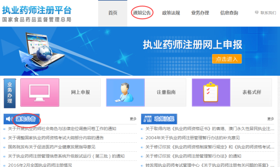 在首頁“通知公告”欄及“通知公告”區(qū)可以查詢及有關執(zhí)業(yè)藥師注冊的各類通知公告,如圖:
