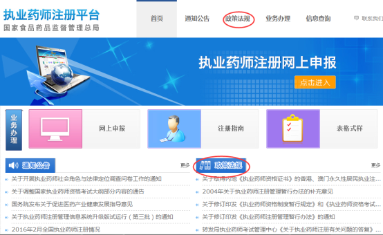 在首頁“政策法規(guī)”欄及“政策法規(guī)”區(qū)可以查詢及有關執(zhí)業(yè)藥師注冊的各類政策法規(guī),如圖: