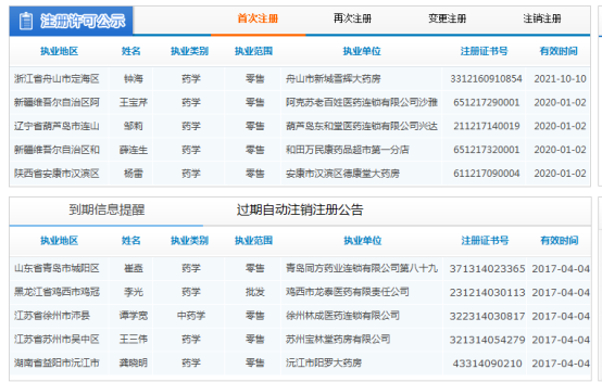 部分注冊許可信息在“注冊許可公示”區(qū)顯示,如圖: