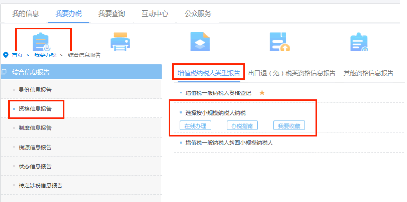 登錄路徑:【我要辦稅】—【綜合信息報(bào)告】—【資格信息報(bào)告】—【增值稅納稅人類型報(bào)告】-【選擇按小規(guī)模納稅人納稅】—【在線辦理】