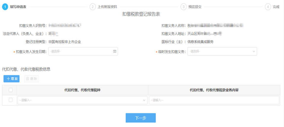 按實(shí)際情況填寫申請(qǐng)表。申請(qǐng)表填寫完成后點(diǎn)擊【下一步】進(jìn)入下一個(gè)環(huán)節(jié)。