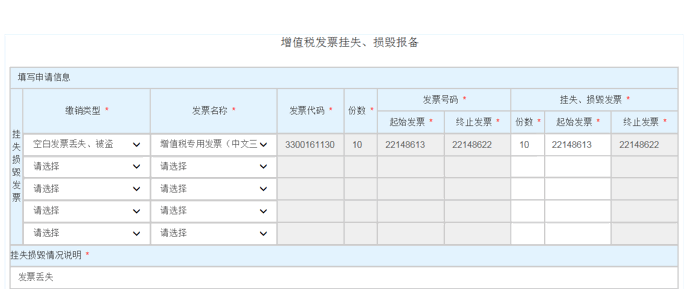 (3)據(jù)實(shí)填寫增值稅發(fā)票掛失、損毀發(fā)票的份數(shù)和起始號(hào)碼,系統(tǒng)會(huì)自動(dòng)帶出終止發(fā)票號(hào)碼。