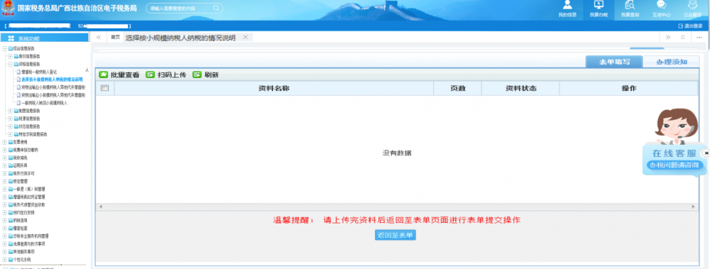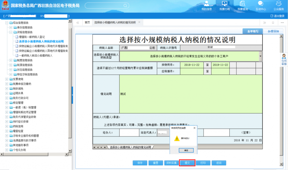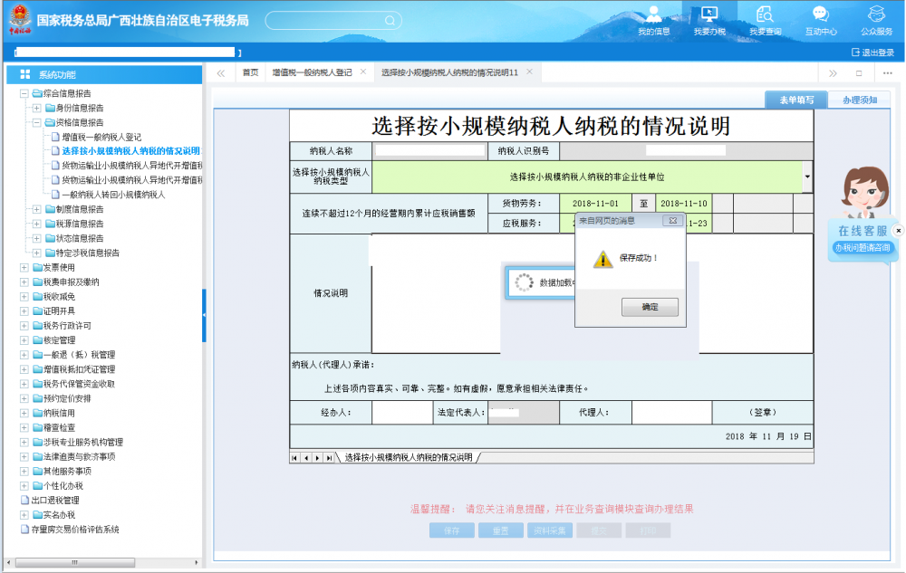 登錄廣西電子稅務局填寫表單,點擊【保存】按鈕,待頁面彈出提示框提示“保存成功”