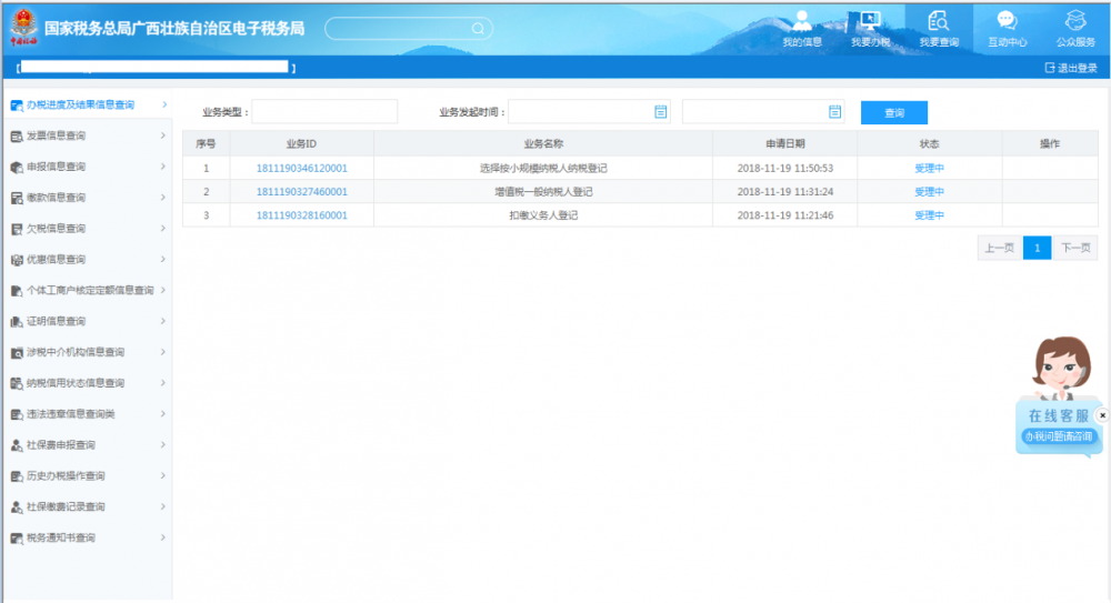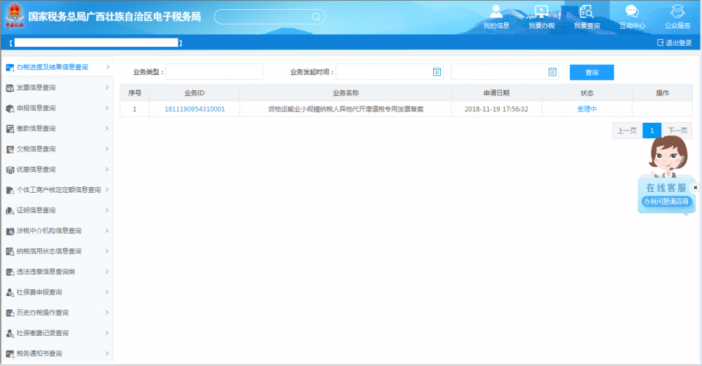 業(yè)務提交后,可通過右上角【我要查詢—辦稅進度及結果信息查詢】,查看該業(yè)務辦理進度及業(yè)務狀態(tài):