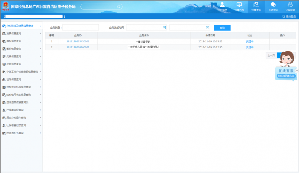 業(yè)務(wù)提交后,可通過(guò)右上角【我要查詢—辦稅進(jìn)度及結(jié)果信息查詢】,查看該業(yè)務(wù)辦理進(jìn)度及業(yè)務(wù)狀態(tài):