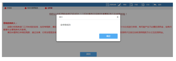 對提交的報表確認(rèn)無誤后,可點(diǎn)擊全申報,系統(tǒng)提示結(jié)果: