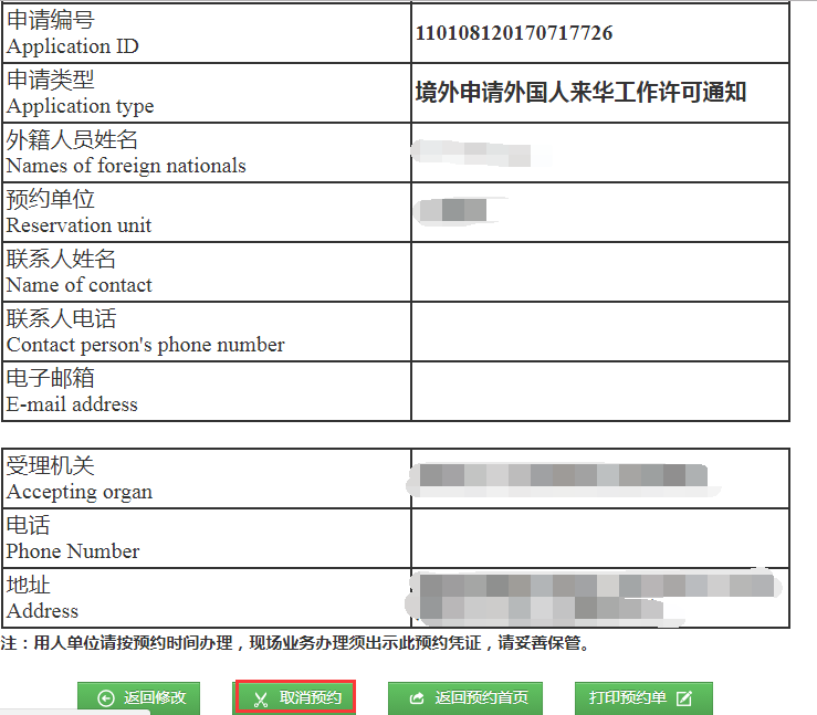 答:在系統(tǒng)里點擊“預約”按鈕后跳轉(zhuǎn)至預約頁面,點擊“返回首頁”按鈕,跳轉(zhuǎn)至預約首頁。在查詢模塊輸入申請?zhí)柣蝾A約號進行查詢,查詢到信息后,頁面下方有“取消預約”的按鈕,點擊并確認即可,如下圖。