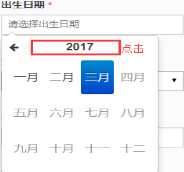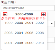 4 系統(tǒng)中的日期項只能通過在時間控件上點選的方式獲取值,不支持手工錄入方式。例如,填寫“出生日期”,鼠標先點擊“出生日期”文本框,彈出時間控件;然后按照下圖所示步驟來選擇日期。