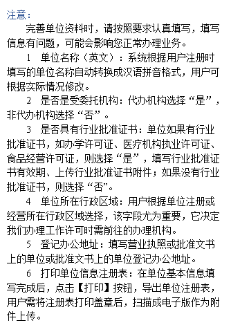 進入“單位資料頁面”后填寫并保存單位基本信息,然后上傳單位附件信息,再填寫保存經(jīng)辦人信息,填寫完成后,在確認信息無誤的情況下,點擊【提交審核】按鈕,提交成功后需等待審核人員審核。