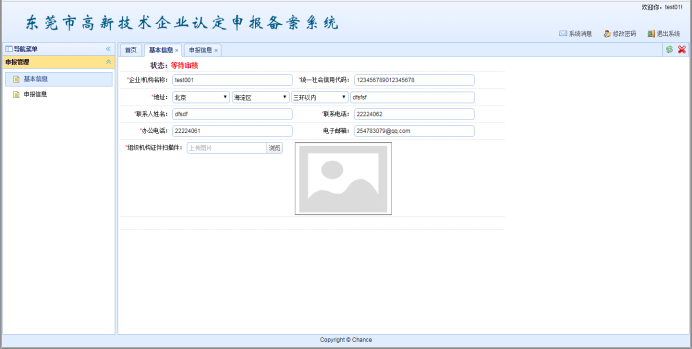 登錄成功后,進(jìn)入系統(tǒng)主頁面,首頁顯示了系統(tǒng)消息,點(diǎn)擊左側(cè)菜單欄的“基本信息”,填寫企業(yè)的基本信息,并點(diǎn)擊“保存/提交”按鈕,提交至管理員處進(jìn)行審核。