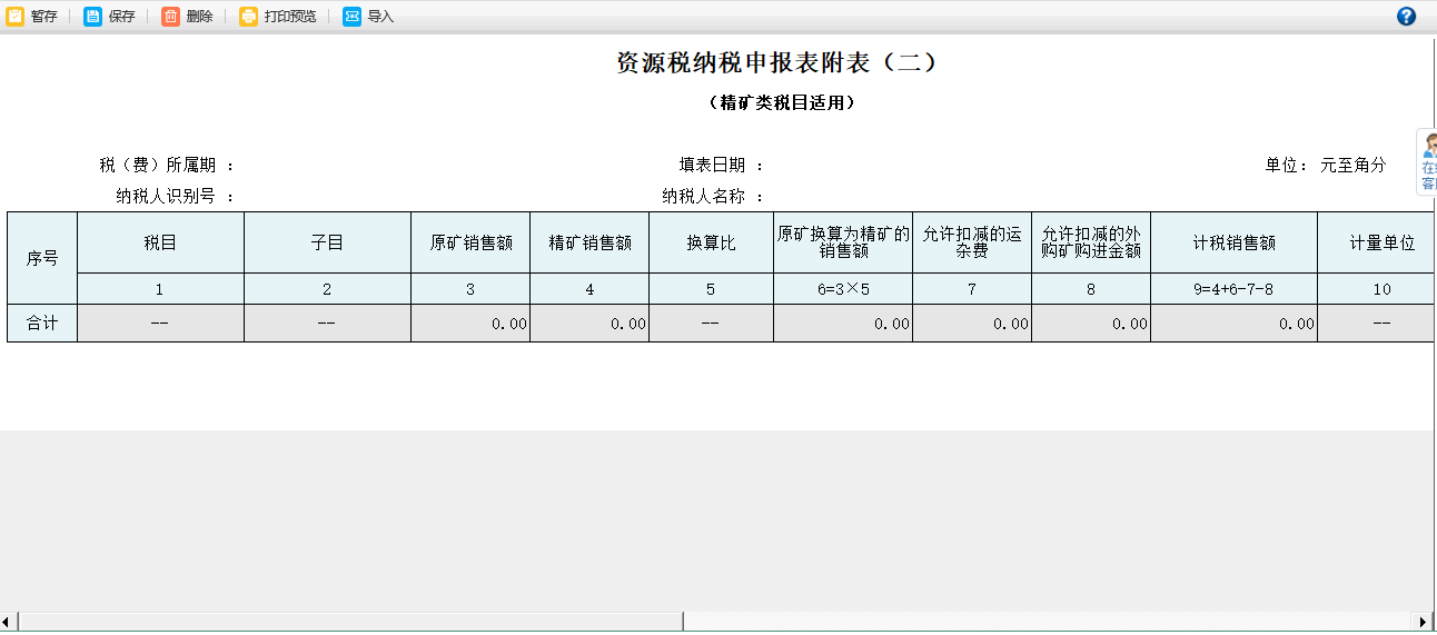 3.稅目、子目、折算率或換算比等自動帶出。填寫附表之后,會將對應信息回填到主表中。附表(一)原礦類稅目適用,附表(二)精礦類稅目適用,附表(三)減免稅明細,按照實際情況,填寫相應的附表,之后在主表進行保存、申報、導出,返回操作;