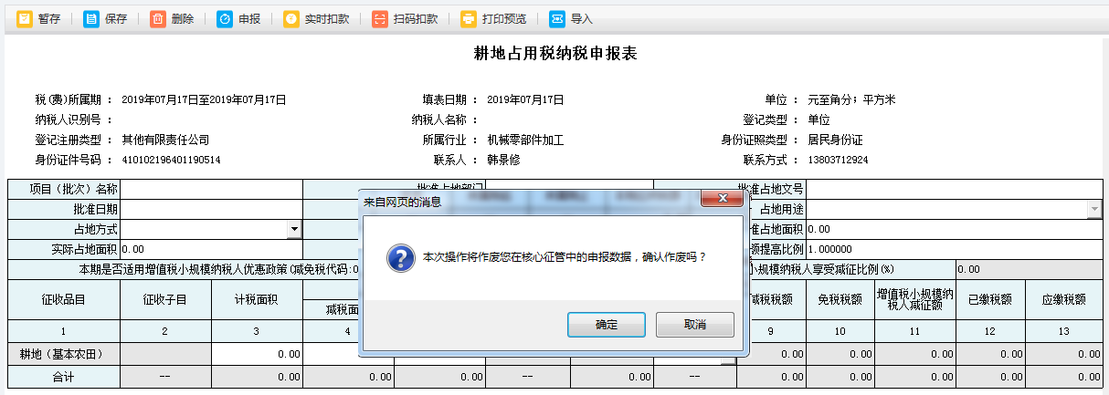 3.保存后如果發(fā)現(xiàn)數(shù)據(jù)有問(wèn)題,可點(diǎn)擊【刪除】按鈕進(jìn)行刪除保存數(shù)據(jù),待頁(yè)面彈出提示框提示“確定刪除此報(bào)表?”,點(diǎn)擊【確定】按鈕,表單填寫的內(nèi)容被刪除: