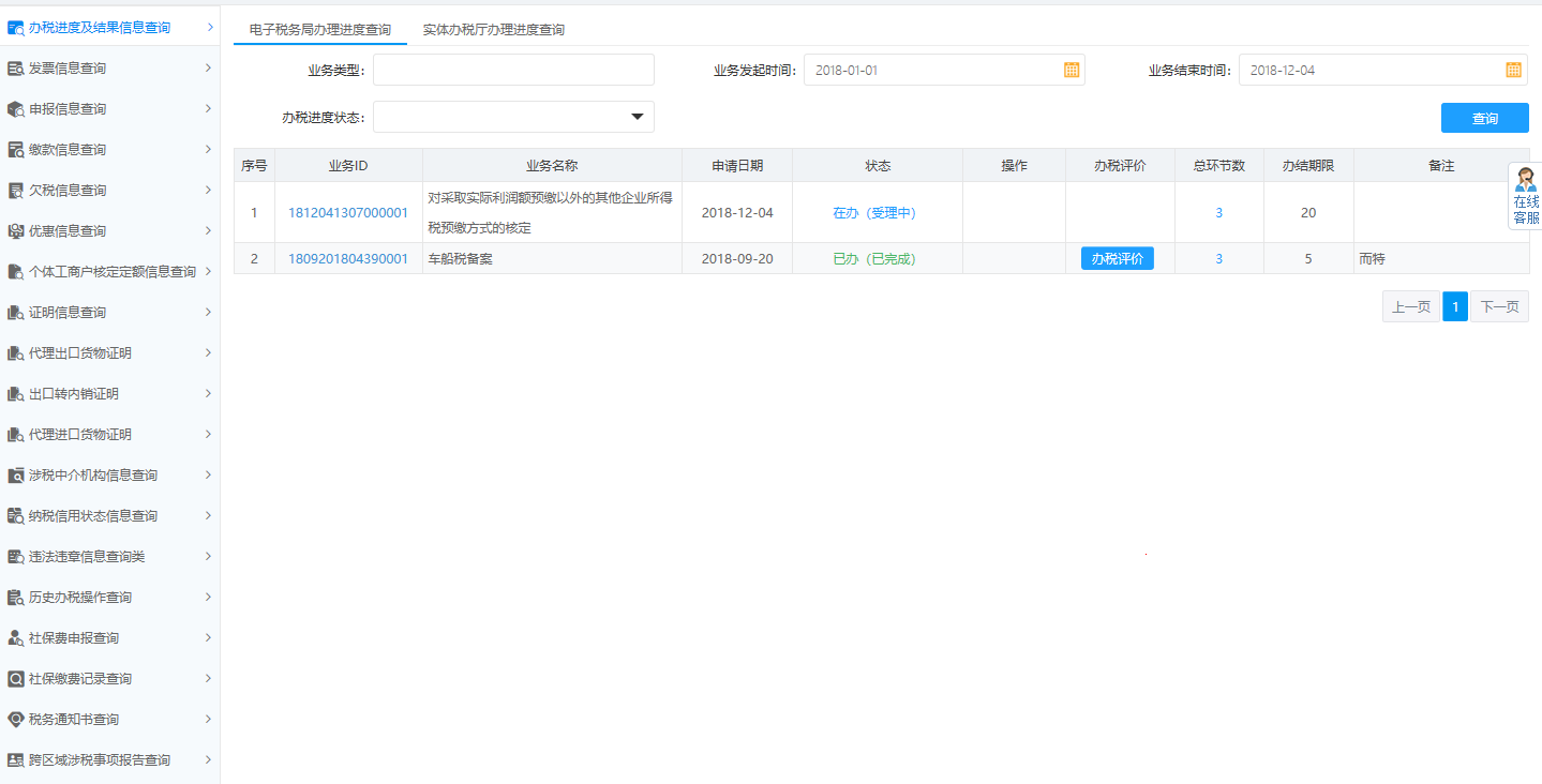 業(yè)務(wù)提交后,可在【辦稅進度及結(jié)果信息查詢】,查看該業(yè)務(wù)辦理進度及業(yè)務(wù)狀態(tài):