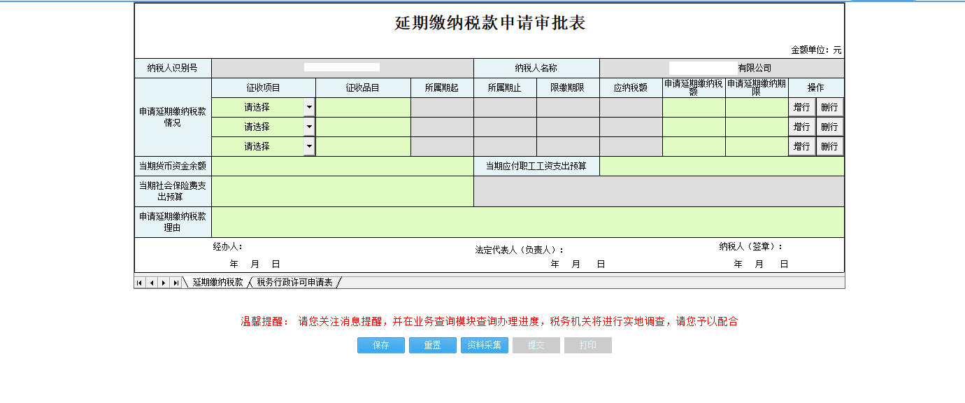 1.打開模塊,需要填寫【延期繳納稅款】和【稅務(wù)行政許可申請表】兩個表單,如下: