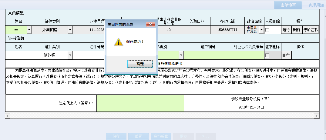 2.點擊【保存】按鈕,待頁面彈出提示框提示“保存成功!”,點擊【確定】按鈕,表單填寫的內(nèi)容被保存。