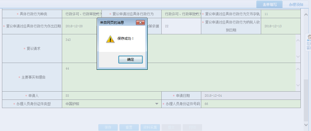 點擊【保存】按鈕,待頁面彈出提示框提示“保存成功!”,點擊【確定】按鈕,表單填寫的內(nèi)容被保存: