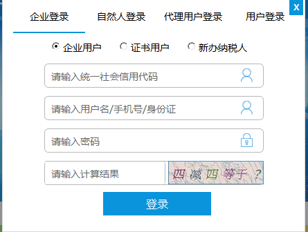 輸入企業(yè)統(tǒng)一社會信用代碼(納稅識別號)、登錄賬戶(手機號、用戶名、身份證)等、登錄身份對應自然人密碼進行登錄。