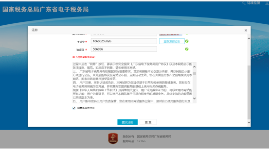 2) 打開“用戶注冊”頁面,辦稅人員按頁面提示輸入用戶名、密碼、圖片驗證碼、手機號、手機號驗證碼,同意電子稅務(wù)局服務(wù)協(xié)議,最后提交注冊,即可注冊一個電子稅務(wù)局的賬號。