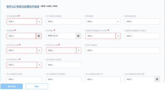 展開“財務會計制度及核算軟件備案”頁面,按照企業(yè)實際情況,選擇財務會計制度,填寫會計核算軟件的詳細信息。