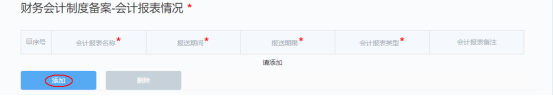 在財務會計制度備案—會計報表情況欄下點擊“增加”,輸入企業(yè)資產(chǎn)負債表、利潤表及現(xiàn)金流量表的報送期間、報送期限和會計報表類型。