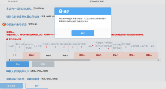 有條件的企業(yè)可直接在線上傳銀行開戶許可證或賬戶賬號開立證明的電子版,或加蓋公章的上述資料復(fù)印件。也可選擇在套餐審批完成后攜帶加蓋公章的上述復(fù)印件前往辦稅服務(wù)廳進(jìn)行資料確認(rèn)。