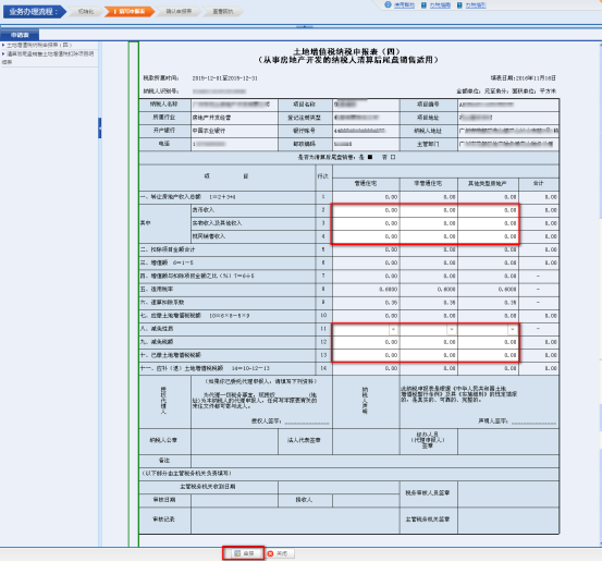 ,進入《土地增值稅納稅申報表(四)(從事房地產(chǎn)開發(fā)的納稅人清算后尾盤銷售適用)》填寫申報數(shù)據(jù)。(填寫規(guī)則與紙質(zhì)報表完全相同)。填寫完成后,點擊