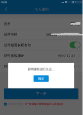 根據(jù)系統(tǒng)提示做相關(guān)動作完成活體驗證流程。當跳轉(zhuǎn)到支付寶進行活體身份信息校驗提示認證失敗原因為“您提供的身份信息與當前登錄賬號實名信息不一致,請確認后重新提交”時,廣東電子稅務(wù)局app出現(xiàn)下圖提示,點擊“確定”按鈕,即可重新進行實名信息核驗。