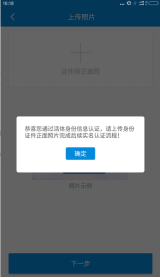 (4)照片上傳完成后,點擊【下一步】進入手機驗證碼校驗過程,輸入手機號碼,點擊【發(fā)送驗證碼】,將手機短信收到的驗證碼輸入界面驗證碼輸入框,點擊【下一步】按鈕完成實名認證。