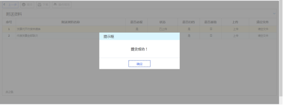 5、 附列資料逐個(gè)上傳完畢,點(diǎn)擊 “提交”按鈕,系統(tǒng)將提示提交成功,該申請?zhí)峤坏蕉悇?wù)機(jī)關(guān)系統(tǒng)中,申請操作全部完成。