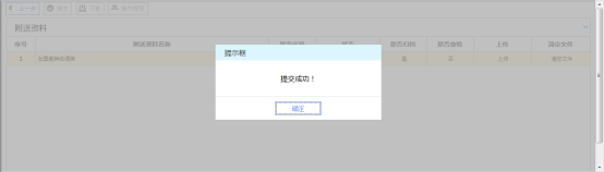 6、 附列資料逐個(gè)上傳完畢,點(diǎn)擊 “提交”按鈕,系統(tǒng)將提示提交成功,該申請(qǐng)?zhí)峤坏蕉悇?wù)機(jī)關(guān)系統(tǒng)中,申請(qǐng)操作全部完成。