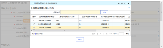 2、 將鼠標放在項目編號處回車,系統(tǒng)帶出不動產項目信息選擇頁面,操作人員勾選或者通過項目編號查詢需要申報的不動產信息,確認后點擊 “確定”帶回主頁面。