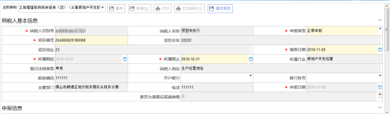 3、 依據不動產清算后尾盤銷售情況填寫主副申報表信息,確認數據錄入無誤后,點擊 “申報”按鈕。系統(tǒng)提示,申報成功,提示是否進行網上扣款。點擊 “是”跳轉到【稅款繳納】-【網上納稅】頁面進行繳稅。