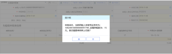 5、 確認(rèn)填寫無誤后,查看主表數(shù)據(jù),確認(rèn)數(shù)據(jù)正確后,點(diǎn)擊“保存”按鈕。系統(tǒng)提示,申報(bào)成功,提示是否進(jìn)行網(wǎng)上扣款。點(diǎn)擊 “是”跳轉(zhuǎn)到【稅(費(fèi))繳納】-【聯(lián)合繳款】頁面進(jìn)行繳稅。
