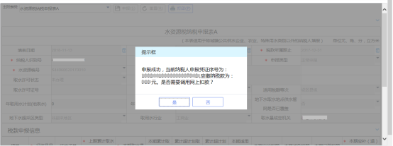 3、 附表填寫完成后,點(diǎn)擊主附表樹(shù)回到【水資源稅納稅申報(bào)表A】,點(diǎn)擊“申報(bào)”,提示申報(bào)成功,保存相關(guān)信息進(jìn)行申報(bào),點(diǎn)擊“是”按鈕跳轉(zhuǎn)到【稅(費(fèi))繳納】—【聯(lián)合繳款】頁(yè)面進(jìn)行繳稅。
