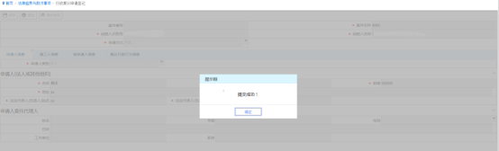 3、 點擊“提交”按鈕,系統(tǒng)將提示提交成功,該申請?zhí)峤坏蕉悇諜C關系統(tǒng)中,申請操