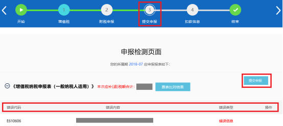 (6)某類報(bào)表的全部表單均填寫完成后,進(jìn)入“提交申報(bào)”節(jié)點(diǎn)。進(jìn)入該節(jié)點(diǎn)后,系統(tǒng)會對納稅人填寫的申報(bào)數(shù)據(jù)進(jìn)行邏輯校驗(yàn),如果存在校驗(yàn)不通過的信息,將展示在錯誤提示欄;如果校驗(yàn)通過,納稅人點(diǎn)擊【提交申報(bào)】按鈕正式提交申報(bào)數(shù)據(jù)。