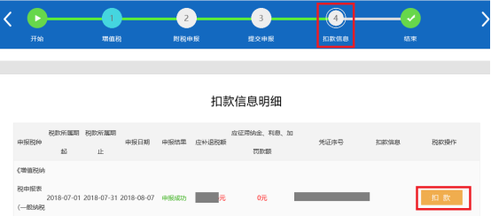 (7)提交申報(bào)成功后,點(diǎn)擊【下一步】按鈕進(jìn)入“扣款信息”節(jié)點(diǎn),該節(jié)點(diǎn)對應(yīng)的頁面將展示納稅人當(dāng)期需要交納的稅款明細(xì),納稅人點(diǎn)擊【扣款】按鈕發(fā)起扣款。