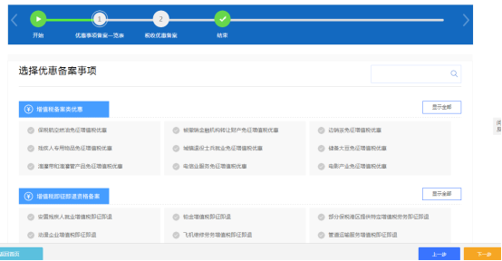 2.檢測條件均通過后,點擊“下一步”進入優(yōu)惠備案事項選擇界面。通過右上角的搜索按鈕可以快捷搜索優(yōu)惠備案事項。