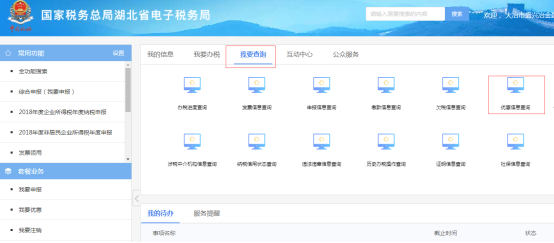 納稅人在登錄后,通過首頁【我要查詢】——【優(yōu)惠信息查詢】進(jìn)入。