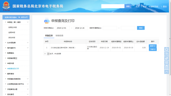 第七步:操作人員可在【申報查詢及打印】模塊,輸入“稅款所屬期起”“稅款所屬期止”,點擊“查詢”,對申報的報表進行查詢打印。