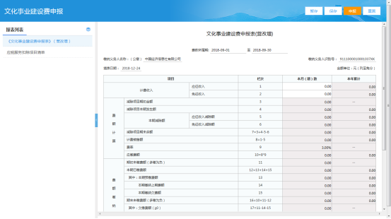 第四步:填寫報表后,若不想立即申報,則可點擊[暫存],下次打開報表即會帶出填寫的數(shù)據(jù);若帶出的表單或者表單數(shù)據(jù)不正確,點擊【重置】,重新加載表單填寫數(shù)據(jù)。。
