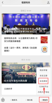 ? 進入“福建稅務”微信公眾號,如尚未關注微信公眾號或尚未辦理實名注冊用戶,請參考本文檔2.1章節(jié)進行操作;已完成上述操作步驟用戶選擇【微服務】-【實名綁定】菜單。