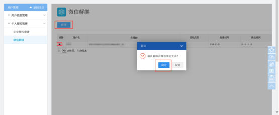 ? 在【微信解綁】頁面,選擇需要解除綁定關系的用戶信息,點擊【解綁】,提示確認解綁該微信微信綁定關系,點擊確定則解除綁定關系,點擊取消則不解除綁定關系;解除微信綁定關系后,則無法使用微信掃碼登錄功能。