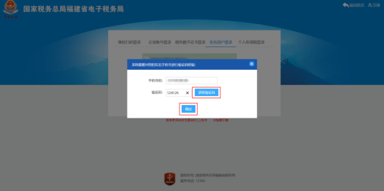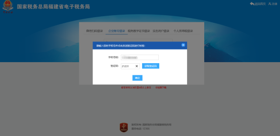 ? 根據(jù)提示,輸入當前辦稅人員手機號碼,點擊【獲取驗證碼】,輸入收到的驗證碼后點擊【確定】。