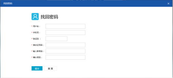 ? 在登錄界面點擊【找回密碼】,出現(xiàn)找回密碼界面,輸入用戶名、手機號、驗證碼、輸入新密碼和確認密碼,點擊【提交】即可。