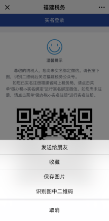 ? 未關注“福建稅務”微信公眾號用戶,需先根據(jù)提示,關注“福建稅務”微信公眾號。長按頁面二維碼圖片,點擊【識別圖中二維碼】,完成關注。