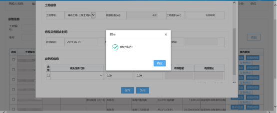 ? 系統(tǒng)出現(xiàn)保存成功頁(yè)面,點(diǎn)擊【確定】,完成土地應(yīng)稅明細(xì)信息采集。