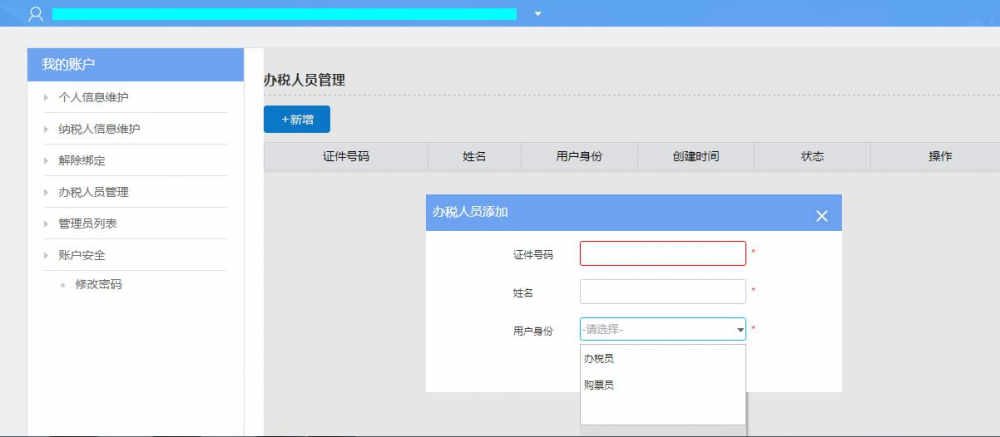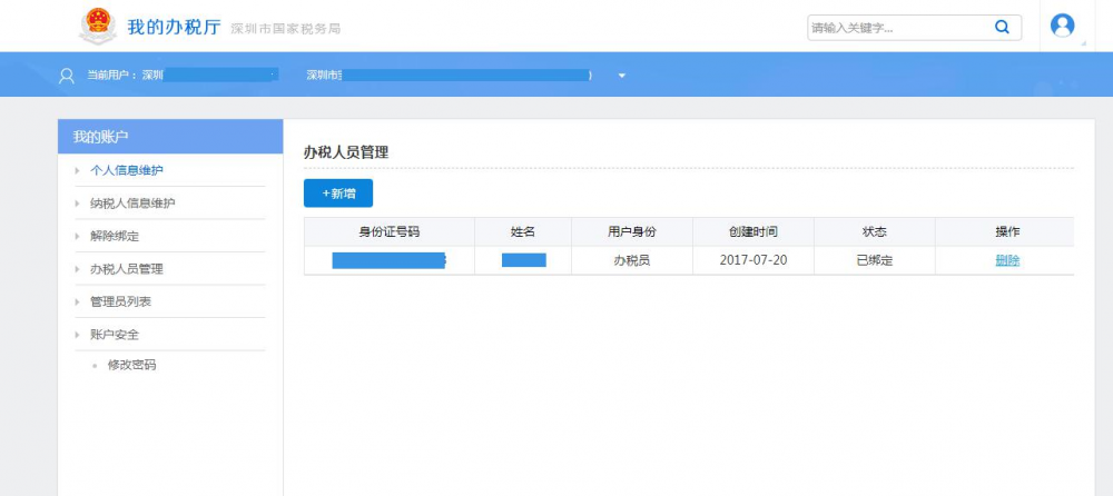 1、實(shí)名登錄選擇企業(yè)身份,進(jìn)入我的賬戶—>辦稅人員管理,選擇對應(yīng)信息進(jìn)行新增操作。