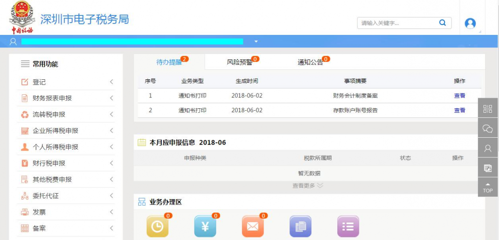 登錄成功后,進(jìn)入深圳市電子稅務(wù)局首頁